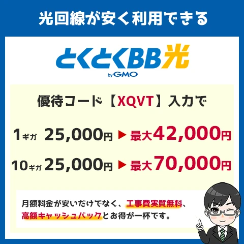 優待コード【XQVT】入力で1ギガ42,000円!10ギガ70,000円キャッシュバック