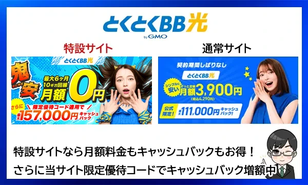 サービス内容は特設サイトから申し込んでも変わりありませんので、GMOとくとくBB光は特設サイトからの申し込みが断然お得です。