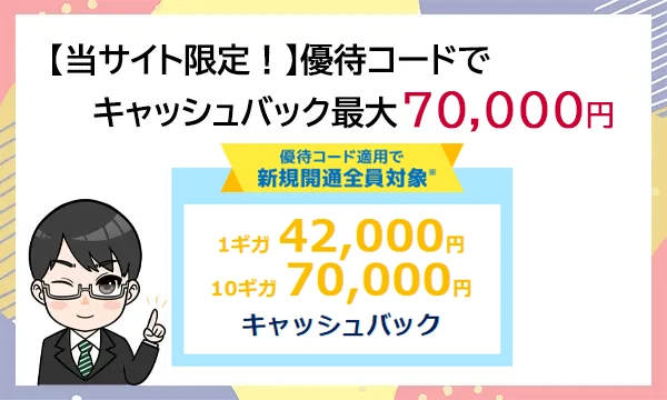 優待コードの利用でキャッシュバック最大42,000円(10ギガプランなら70,000円)