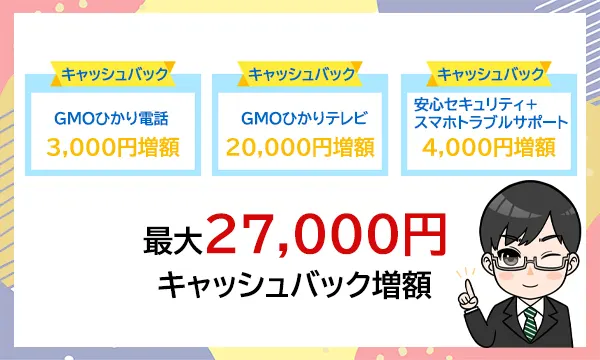 GMOとくとくBB光の申し込みと同時に指定オプションサービスを申し込むと、最大27,000円キャッシュバックが増額されます。