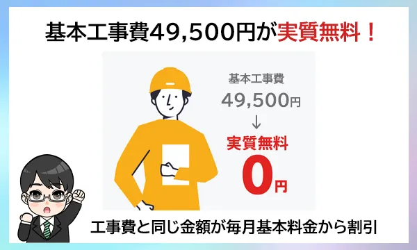 | 工事費 | 戸建て:42,150円 ⇒ 実質0円 マンション:33,000円 ⇒ 実質0円 |