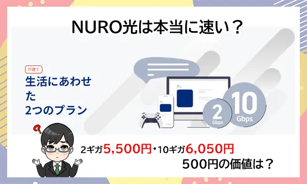 NURO光はソフトバンク光に比べ月額料金が安く、下りの通信速度は倍の最大2Gbpsとなっています。