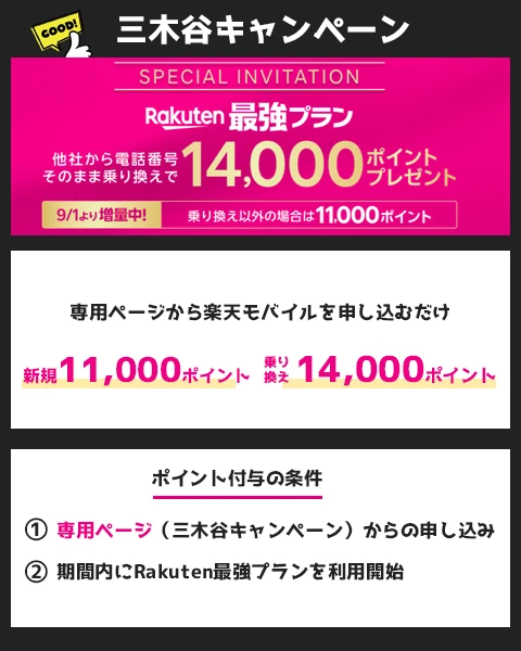 三木谷キャンペーンでは、楽天モバイルへ乗り換えるだけで14,000ポイント新規の方でも11,000ポイントもらえて、条件も専用ページから申し込みをするだけと簡単です。